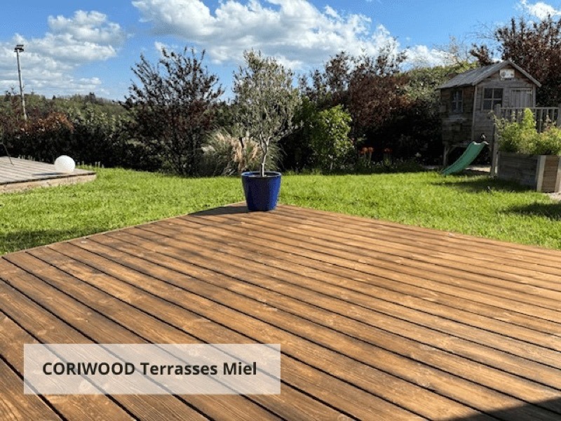 Dans le second témoignage, la terrasse rénovée a été protégée avec le saturateur monocouche CORIWOOD en teinte Miel. C’est une huile végétale naturelle qui imprègne le bois et fait ressortir son veinage. Les professionnels s’accordent à dire que cela donne aux terrasses en bois un aspect bois mouillé ou bois huilé très apprécié.