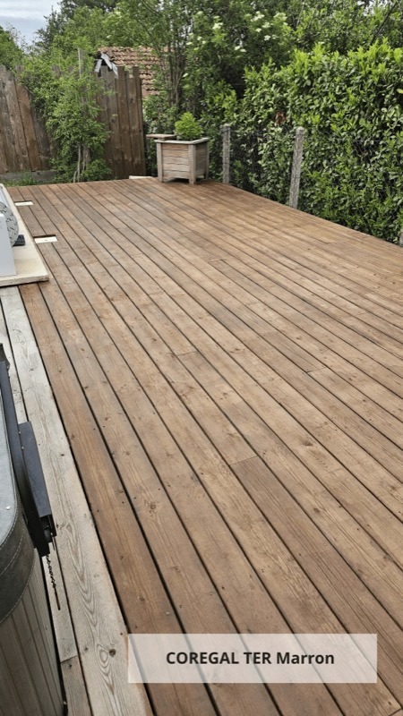 Dans le premier témoignage de rénovation de terrasse en bois, c’est le saturateur COREGAL TER qui a été appliqué en teinte Marron pour protéger le bois. C’est un saturateur à base de résine acrylique qui demande 1 ou 2 couches et donne un beau fini mat uniforme.