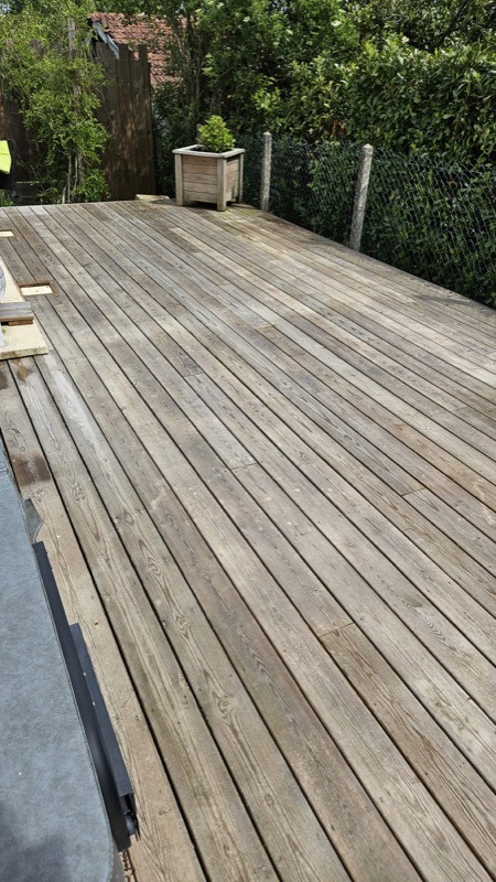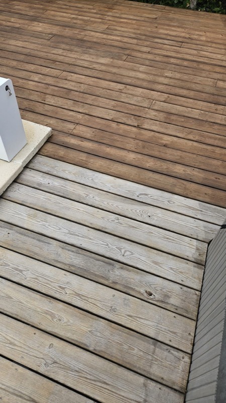 Voici le témoignage de deux chantiers de rénovation de terrasses en bois avec des photos avant/après. Dans chaque projet, les lames de bois des terrasses ont été dégrisées avec un dégriseur puis protégées avec un saturateur.