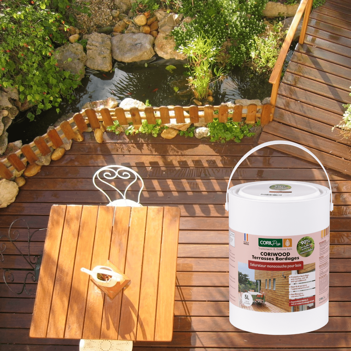 Les saturateurs CORIWOOD Terrasses Bardages et CORIWOOD HUV Hydro contiennent jusqu’à 90 % de matières premières renouvelables, offrant une solution performante et écologique.