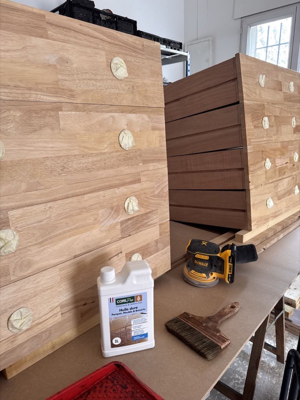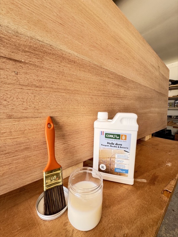 Pour la finition, Ludovic a choisi notre Huile dure – Parquet, Meuble & Boiserie. Après l’application de deux couches et un égrainage soigné entre les passes, le rendu est tout simplement magnifique. L’aspect mat ciré donne au bois un rendu très naturel. Il révèle toute sa chaleur, tout en étant parfaitement protégé contre les taches et l’usure du quotidien.